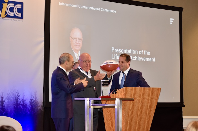 Jack Schwarz, Senior General Partner, Schwarz Partners, was presented with the Fastmarkets RISI Lifetime Achievement award during the International Containerboard Conference, Nov. 14-15 at the Eden Roc hotel in Miami Beach, Fla. Schwarz Partners is a holding company with a focus on the transportation and containerboard industries. Industry-related companies consist of Royal Box Group, LLC, New-Indy Containerboard (a joint venture with the Kraft Group LLC), Carolina Container, Integrity Fiber Supply, Venture Logistics and various sheet feeder facilities.