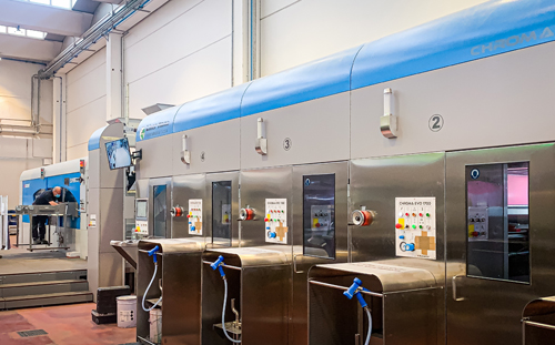 The printer, installed in May 2021, is an HBL bottom printing configuration and it’s equipped with four printing units. The whole line features direct drive technology and a high precision vacuum transport system.