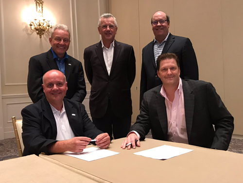 From left (back row) Steve Young, President, AICC; Dale Nolden, Senior Vice President- Sales, WestRock; Kevin Ausburn, Chairman & CEO, SMC Packaging Group & AICC Paperboard, Regulations & Sheet Supply Committee Chairman; (seated) Joseph M. Palmeri, President, Corrugated Packaging, Jamestown Container Companies & AICC Chairman; Tom Stigers, Executive Vice President – Corrugated Paper Solutions, WestRock.