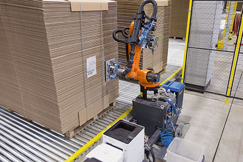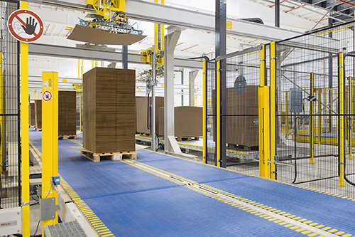The machines are supplied according to demand and with anticipation so that sufficient material is always available. Another key feature of the project is the fully automated feeding of protective and intermediate sheets from the corrugator up to the fully automated palletisers.