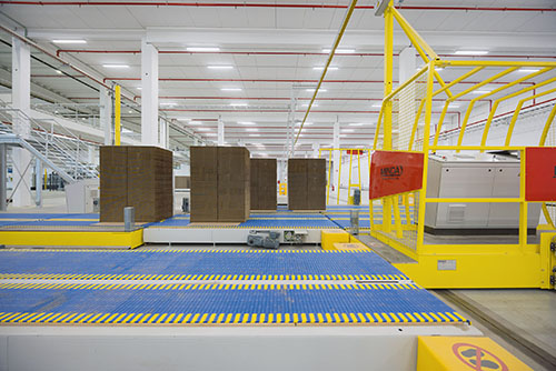 Minda developed an intralogistics system that not only reliably transports and stores the large quantities of products leaving the ultra-modern corrugator at high speeds but also ensures the necessary buffering and supply of the downstream processes. The entire intralogistics system is designed to continuously follow the production output of the corrugator – from the first stack to the finished pallet in the dispatch area.