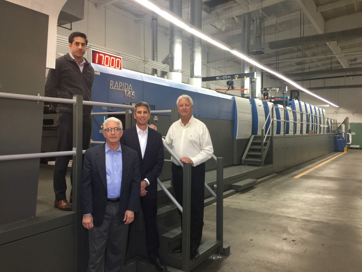 From left: The Advance Paper Box/Packaging Spectrum team: George Rodarte, estimating manager; Nick Silk, president; Evan Gardner, vice president of sales; and Rick Costa, plant manager; in front of the new KBA Rapida 145.