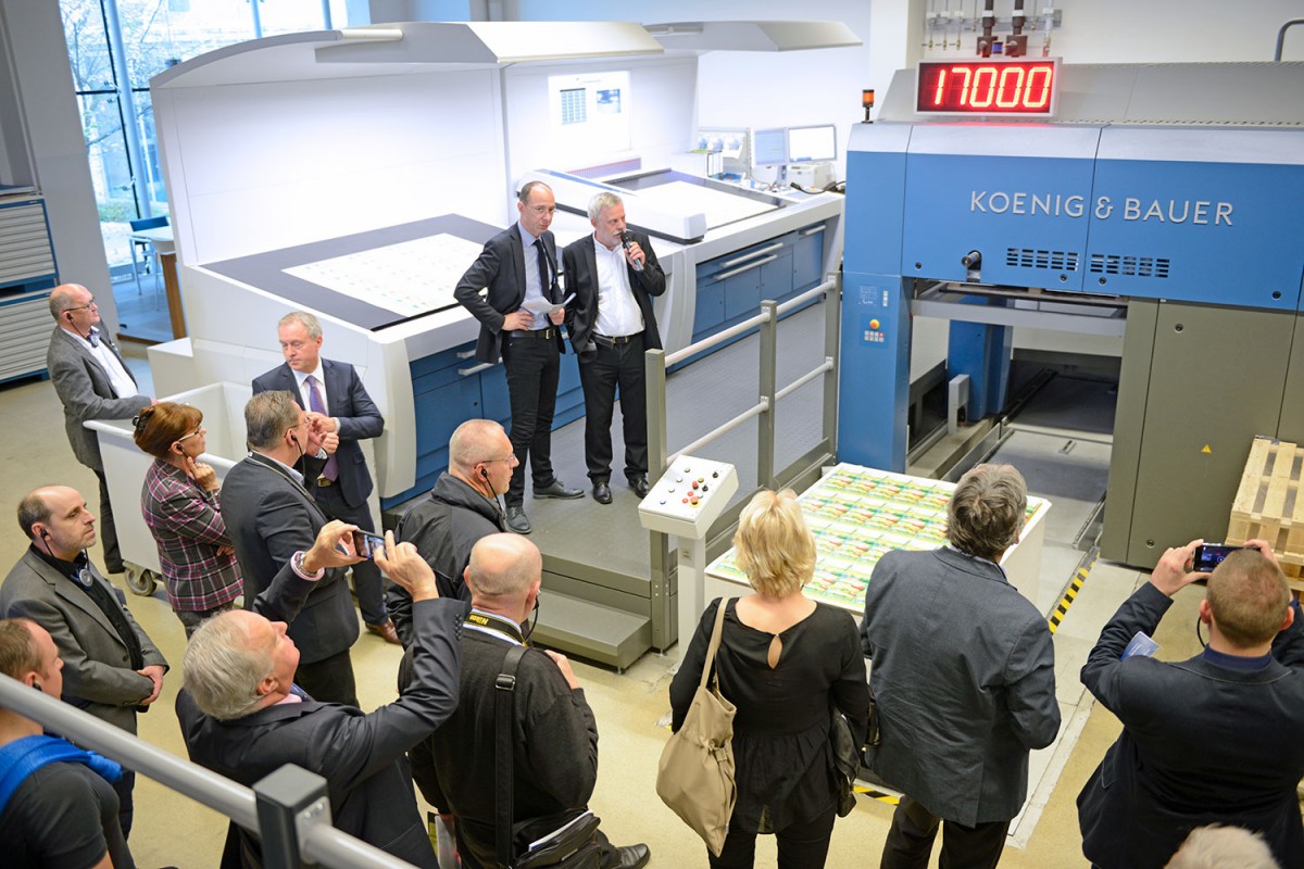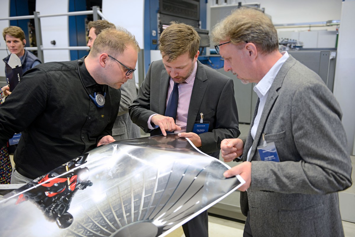 The spectrum of topics at this year’s event was broad; the first session was devoted to packaging printing. In cooperation with Actega and Billerud Korsnäs, interesting finishing effects with UV gloss coatings were demonstrated on a Rapida 106. Further print demos on a Rapida 145 placed fast job changes and dispersion finishes in the foreground. In both cases, there was at the same time opportunity to witness the convincing functionality of the Rapida LiveApp and ProductionApp.