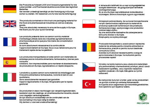 To support the European Commission’s move, ECMA, the European Carton Makers Association and Pro Carton, the European Association of Carton and Cartonboard manufacturers, have issued a document in 11 languages for hauliers to display when transporting printed cartons and cartonboard.