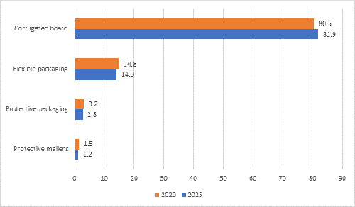 All e-commerce formats will see double digit CAGRs through to 2025. Corrugated is the most valuable segment of the e-commerce packaging market. Value will rise from $30.0 bn in 2019 to $41.6 bn in 2020 and is forecast to more than double again by 2025 as it witnesses the fastest growth of all e-commerce formats.