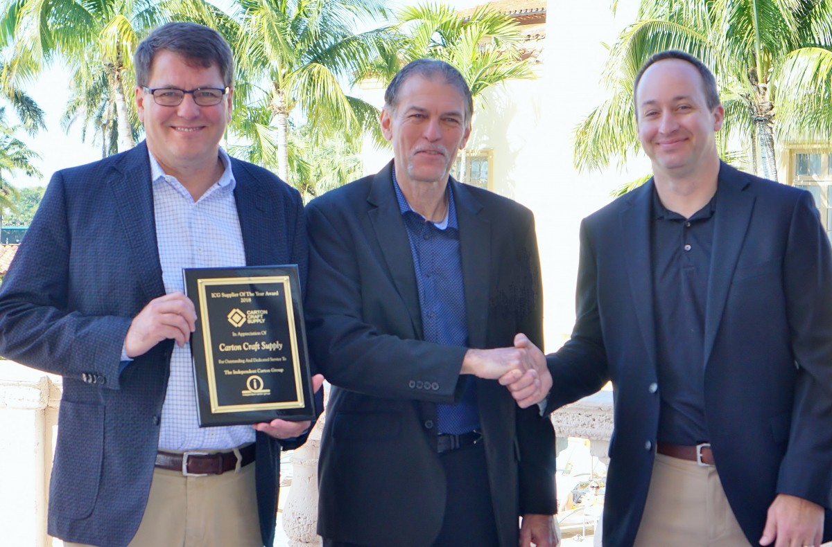 Carton Craft Supply is the recipient of the Independent Carton Group’s (ICG) Supplier of the Year Award for 2018. The award was presented at The Biltmore, a historic luxury hotel in Coral Gables, Florida, during the ICG’s general membership meeting, which was hosted by ICG member Vista Color of Miami. Carton Craft’s Mark Doxtader, owner and president, and Rick Ruckh, account manager, were in attendance to accept the award from the ICG.
