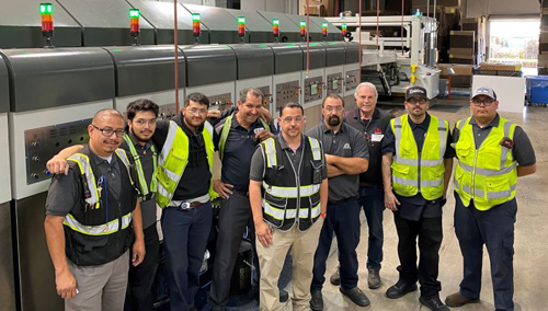 The installation was on a new KL-K7 I/O flexo rotary die-cutter, which can print both sides of the sheet in one pass. The machine is configured to print two colors on the top and three colors with the bottom print units. Pictured below, Larry Chadwick (Senior Service Technician, JB Machinery) with the Bay Cities team after concluding a successful system commissioning.