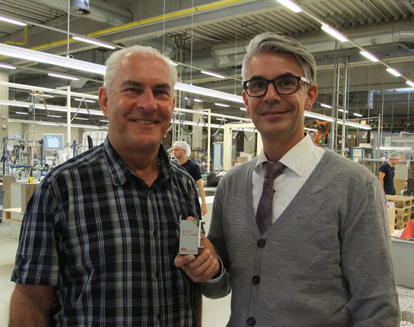Hans-Peter Blockus, Head of Folding Carton Finishing at Kroha in Barleben (left), and Andreas Cebulla, Head of Sales for the East German region at Baumer hhs, proudly present the 5,000th ULT-300 cold glue sensor.