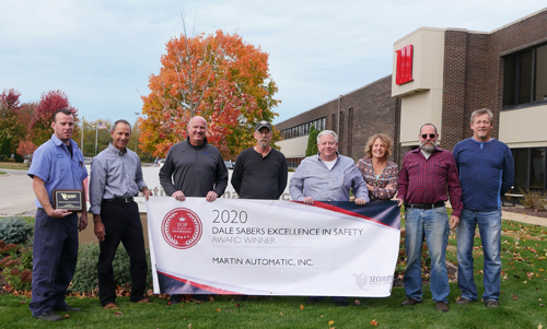 Jon Bauch (third from left) and Martin Automatic’s Safety Committee proudly display the 2020 Dale Sabers Safety Award plaque and banner.