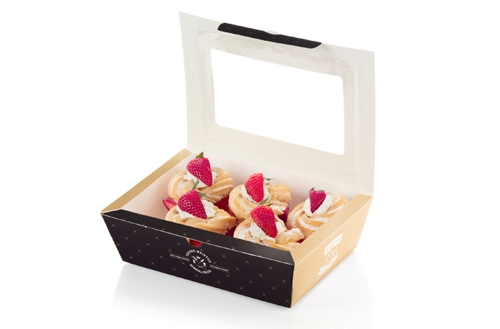 The bakery packaging is made of lightweight MetsäBoard Prime FBB EB, a dispersion coated barrier board, which can be recycled using paper or paperboard collection waste streams. The Prime FBB EB board is thick and resistant to grease, which is key for food that naturally have a high fat content such as pastries and cakes.