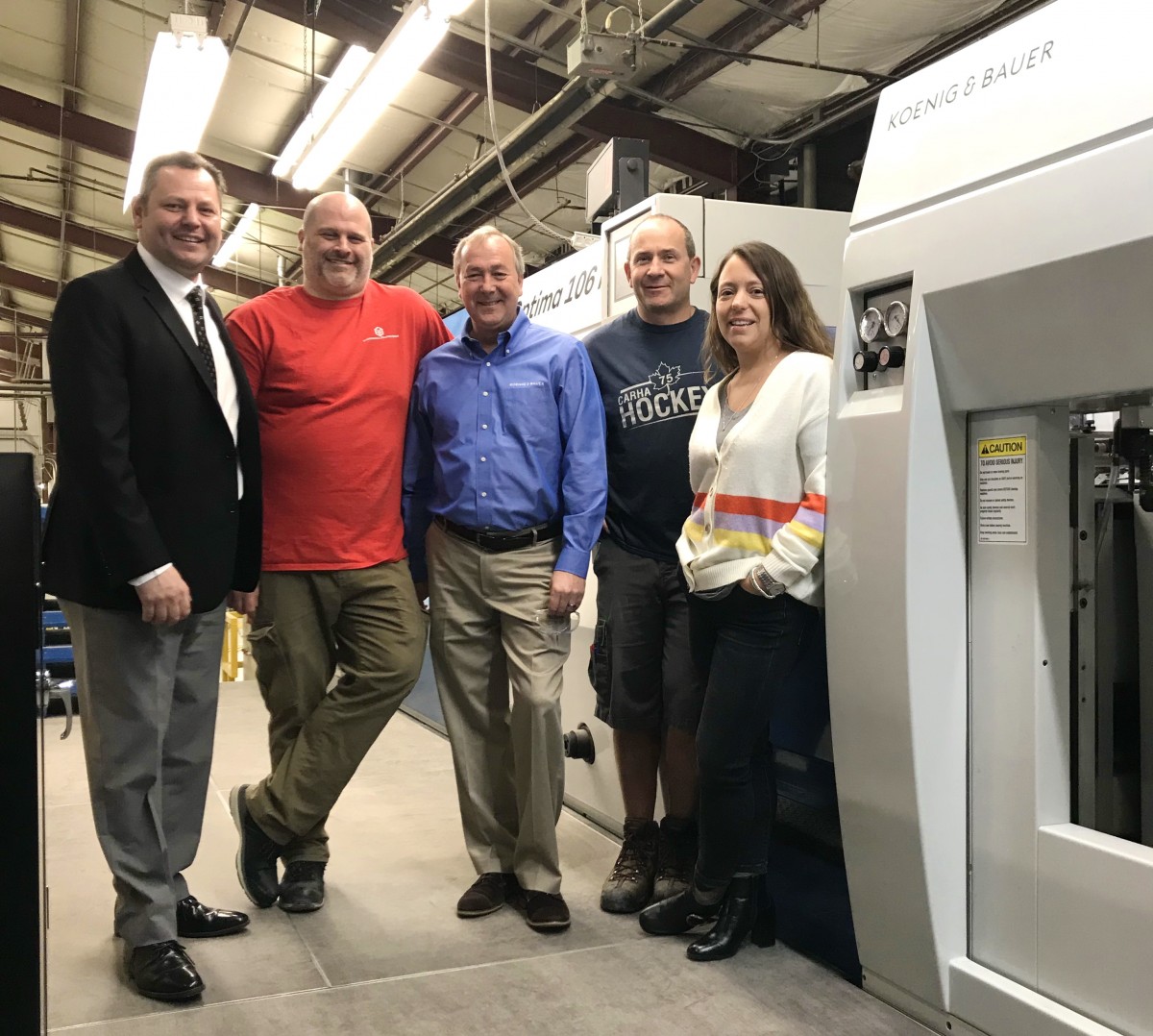 Left to right: Aleks Lajtman, Koenig & Bauer Regional Sales Manager, Canada; Cory Sheritt, Ingersoll Paper Box Post Press Supervisor; Tom Fitzgerald, Koenig & Bauer Product Manager; Murray Weir, Ingersoll Paper Box Diecutter Operator; and IPB President Sarah Skinner in front of the new Koenig & Bauer Optima 106K flatbed diecutter.