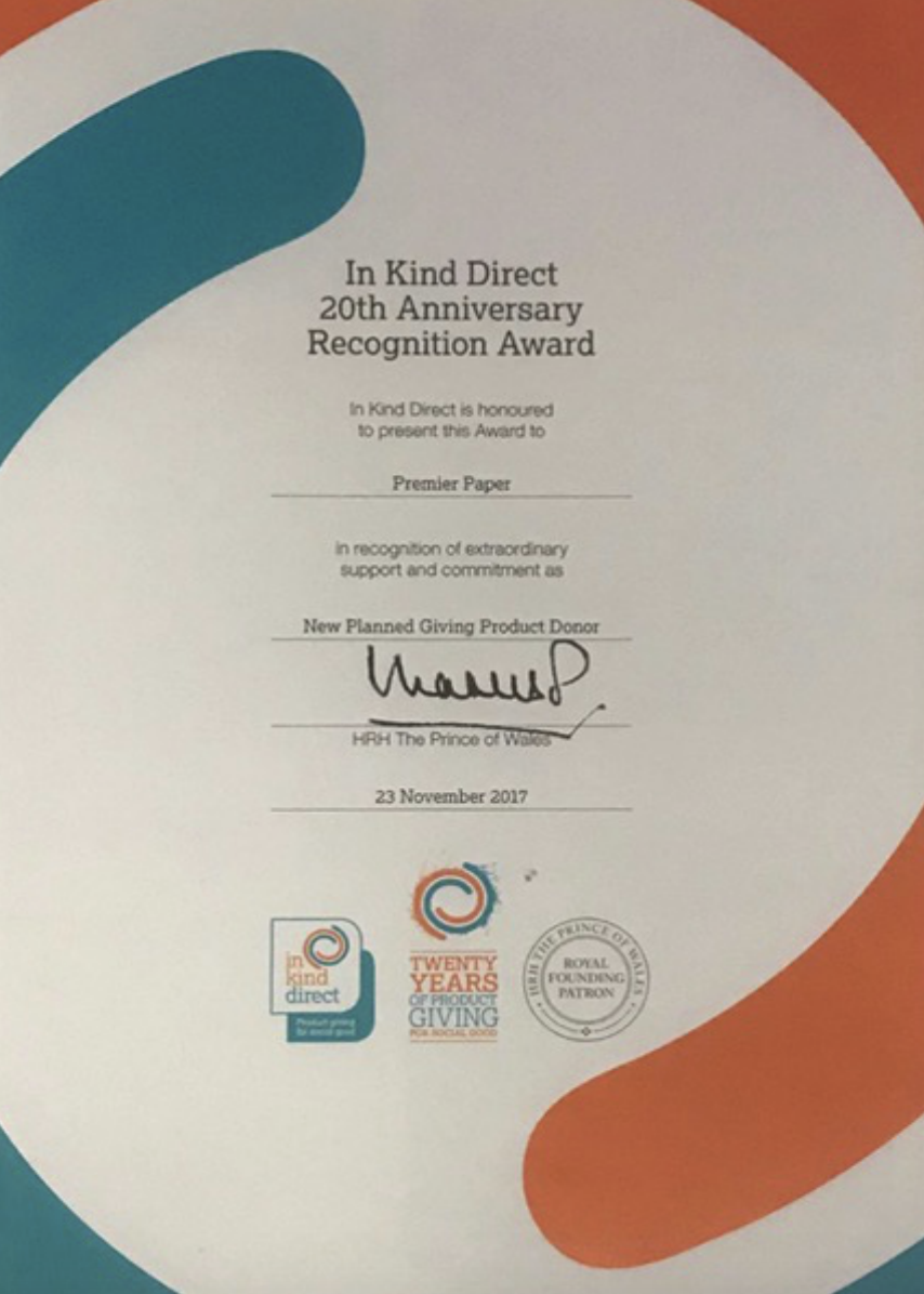 UK based Premier Paper received a royal welcome from HRH the Prince of Wales after being recognised for their support and commitment as a product donor to the In Kind Direct charity. Founded in 1997 by HRH The Prince of Wales, In Kind Direct distributes consumer goods donated by companies to grassroots charities that are tackling a wide range of issues, from child poverty to domestic abuse and disability, providing life’s essentials to vulnerable people across the UK and overseas.