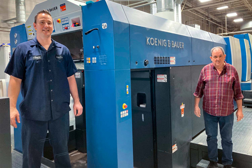 Left to right: The team at SupremeX includes Yanick Dumais and Jacques Michaud, next to the company’s new Koenig & Bauer Rapida 105 PRO.