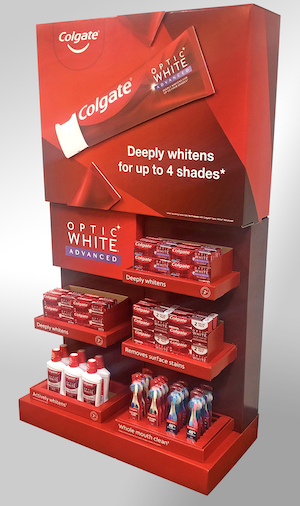 • Colgate® Target Optic White® Advanced Endcap for Colgate-Palmolive. Bronze — Hair Care and Skin Care, Temporary (pictured, above).